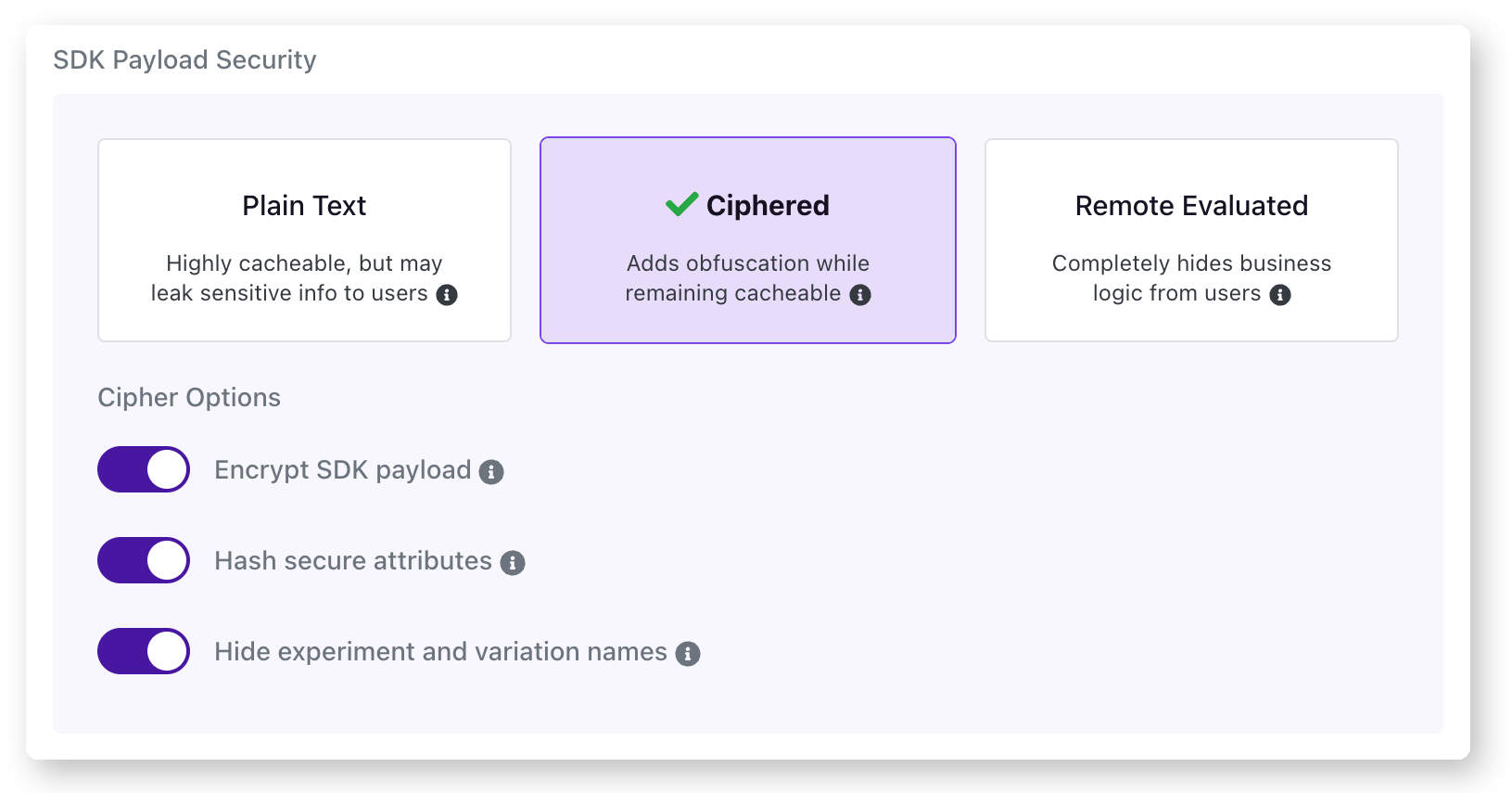 Hash Secure Attributes: With this option, you can hash the attribute values marked as 'secure' in the GrowthBook UI. The targeting conditions referring to these attributes will be anonymized via SHA-256 hashing. Values will be matched based on their hashed results, so the actual values are not visible. Hashed values, however, are not a perfect solution as they can be brute forced with enough effort and time, and they make targeting with regex impractical. When evaluating feature flags in a public or insecure environment (such as a browser), hashing provides an additional layer of security through obfuscation. You can read more about setting this up in GrowthBook here.
