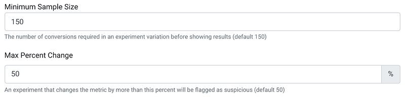 We added support for more customizations on the experiment metrics. You can now set thresholds on the minimum number of conversions a metric needs before we reveal results, as well as the maximum percent change before we flag a result as suspicious.