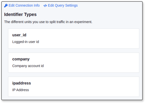 Previously, GrowthBook had two hard-coded user identifier types (or randomization units) — user_id and anonymous_id. This worked for some websites, but was not very flexible. For example, B2B products might want to split users by their company instead of an individual user_id. Or an app might only have logged-in users and have no use for an anonymous_id.