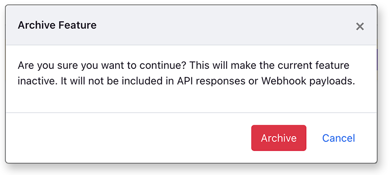 You can now archive features and stop them from showing up in API and webhook payloads, without completely deleting them. Archived features are also hidden by default in the feature list. This is a great way to remove a feature while keeping the full revision history as reference in case you need it later.