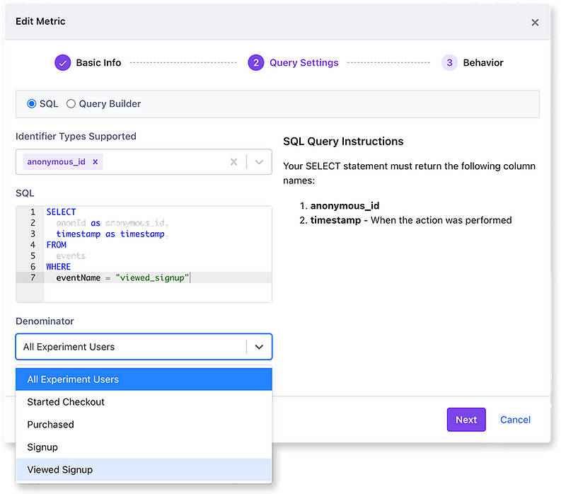 By default, metrics are evaluated against all users in an experiment. Now, we let you customize this by setting a denominator. For example, you can now create ratio metrics like “Revenue per Signup” or “Checkout Completion Rate”. Stay tuned for more updates to ratio metrics to handle even more advanced use cases!