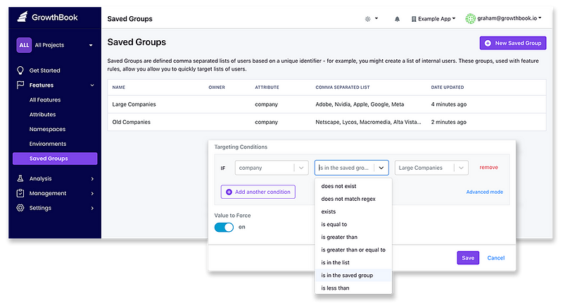 One of our most requested changes is now live! Instead of copy/pasting lists of user ids between feature targeting conditions, you can now define that list once in a Saved Group and easily reference it from multiple places.