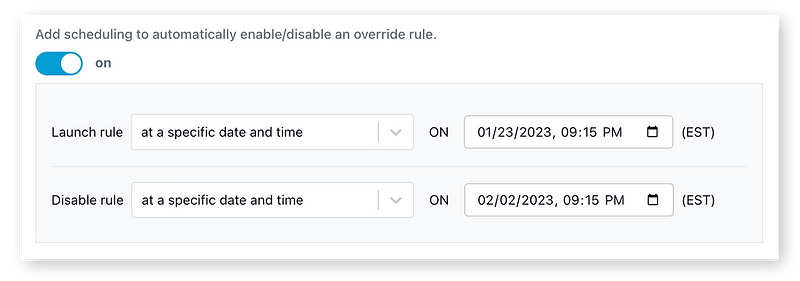 You can now schedule feature rules to be enabled or disabled at specific times. No more waking up at midnight to turn on a sales banner or setting calendar reminders to turn off experiments in two weeks. This feature is available on Pro and Enterprise plans.