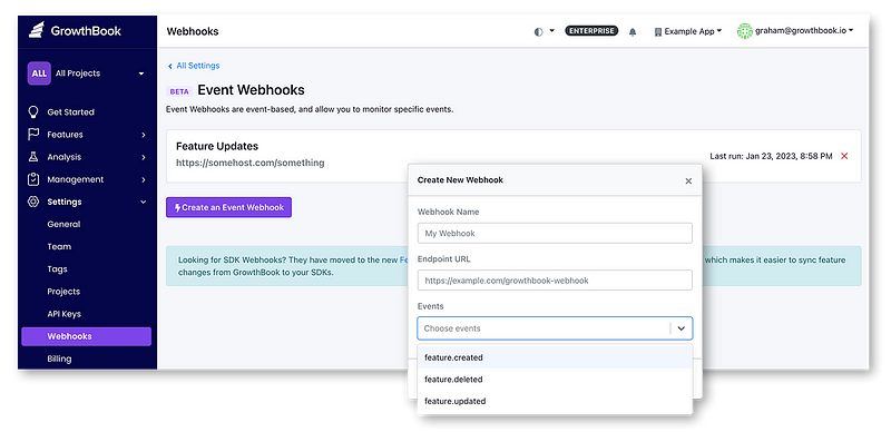 One of our goals is for GrowthBook to integrate with all of the existing tools you use — Slack, Jira, DataDog, you name it. We started this effort in the last release with our REST API and are continuing it now with Event-based Webhooks. As we expand both of these systems in the coming months, you will be able to build complex custom workflows — for example “post in Slack every time an experiment reaches significance” or “turn off feature flag X if DataDog detects an increased error rate.”