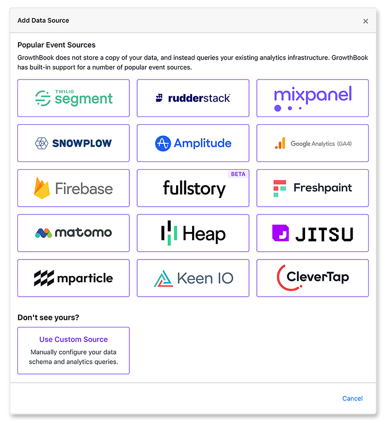 Users of FullStory that have set up a data destination to BigQuery or Snowflake can now use that data for metrics and experiment results from within GrowthBook. This event source is in beta and may require some small adjustments.