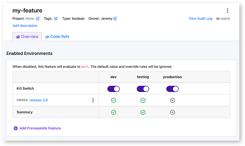With Prerequisites, you can group together related feature flags and describe complex relationships between them. For example, you can have a bunch of features that all reference a `release-2.8` parent flag as a prerequisite. The child features will only be enabled when the parent flag evaluates to `true`.