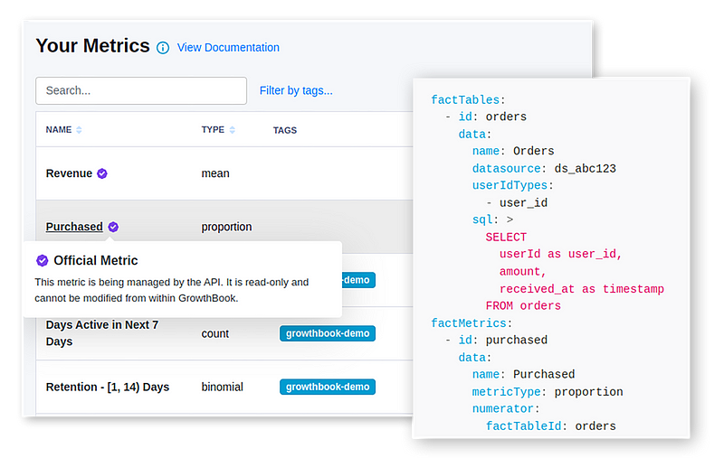 In a nutshell, you can now store your Official Metric definitions as code in a version control system like GitHub and changes can be automatically synced to your GrowthBook account. These Official Metrics are marked with a special badge and cannot be edited from within the GrowthBook UI. Whenever you see the Official badge, you can be confident that the definitions have gone through your version control and review process.