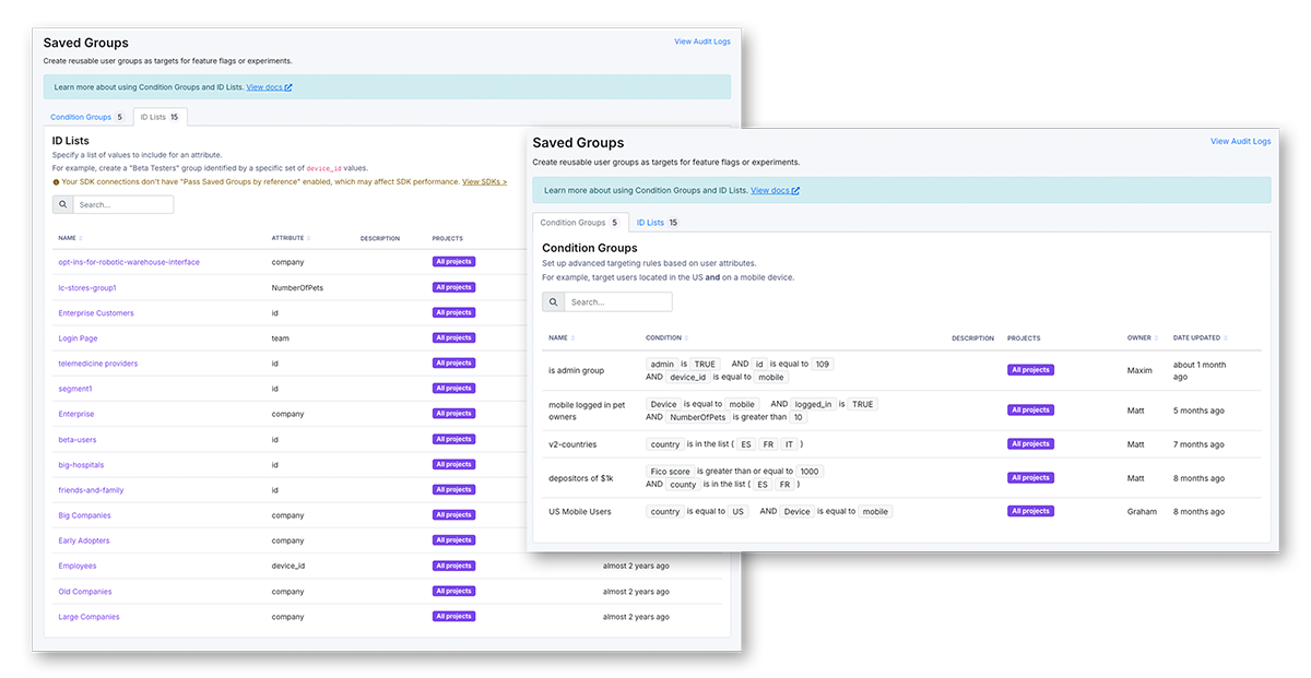 - You can now restrict Saved Groups to specific projects. This is especially useful for larger organizations who have many teams and want to better organize their Saved Groups.