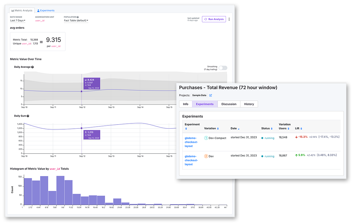 We made two big changes to metrics in this release. First, we added graphs to fact metrics. After creating a fact metric, you can now run an analysis that will look at recent data and display several helpful graphs depending on the metric type. For mean metrics, for example, we show an overall count, daily average, daily sum, and a histogram of metric values. This can help you verify that the metric is set up correctly and reporting the values you expect before adding it to an experiment.