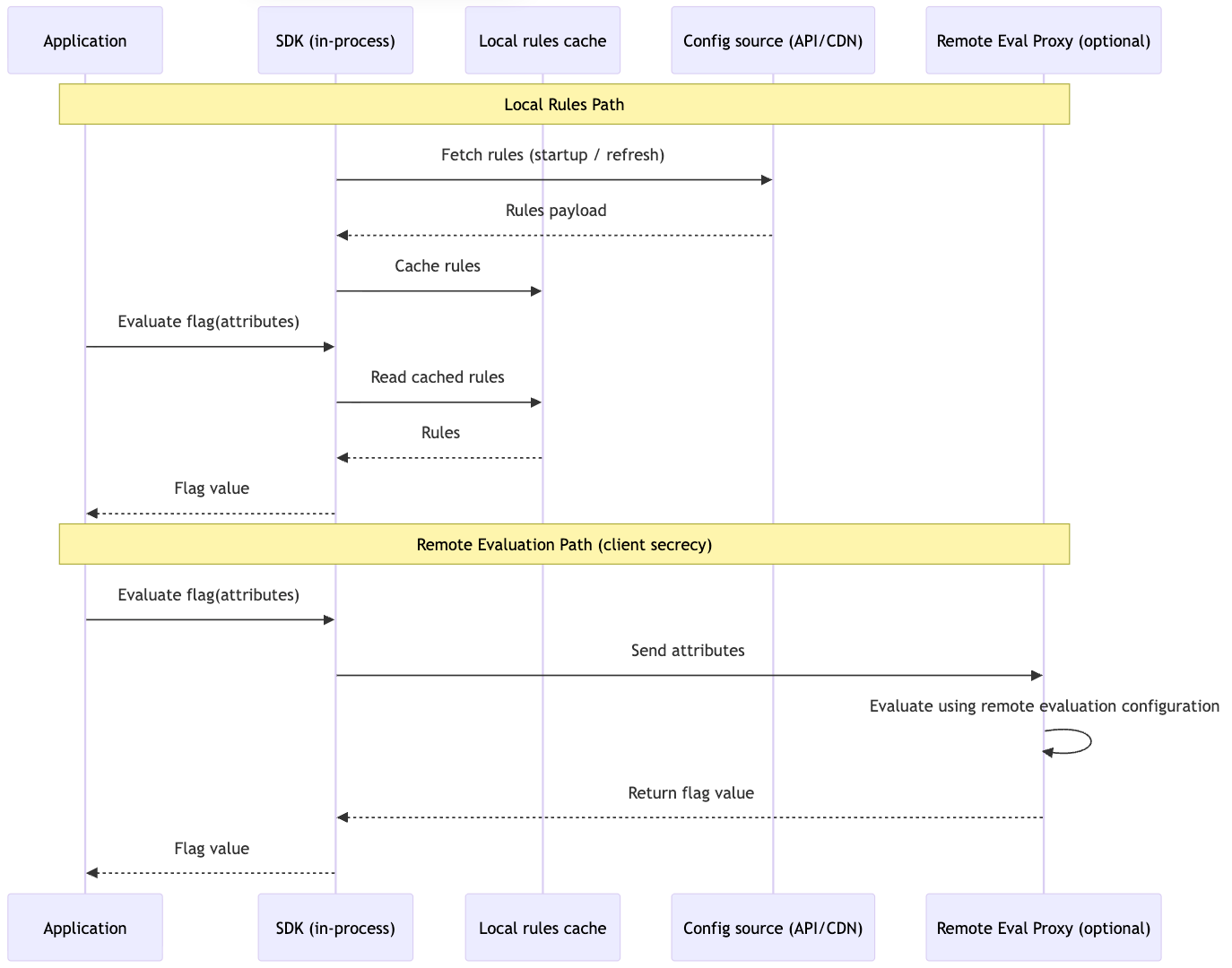 GrowthBook: Often uses a cached-rules model: SDKs fetch a rules payload, keep it locally, and evaluate in-process. If you need to keep targeting rules off the client, GrowthBook supports Remote Evaluation mode via the proxy/edge workers.